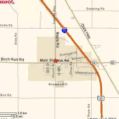 The general location of Birch Run, MI is north of Flint and south of Saginaw MI.  It's easy to find, being just off I-75/US23.