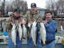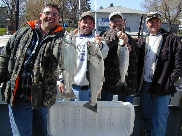 here for Phil's whopper 15.4 lb. Brown Trout 4/14/02 Curt, Randy and Reg were my esteemed angling guests for today's outing on Lake Michigan. During the course of our half day trip, we boxed 6 Brown Trout, including one behemoth 10 to 12 pounder. While the action didn't compare to yesterday's fast pace, we still ended up kinda respectable. It was an enjoyable day for me, because the hordes of boats that plagued the entire shoreline yesterday thinned out considerably. The sum it all up, it was a good time with a terrific and sensible fishing team. Click here for dockside photo 4/13/02
