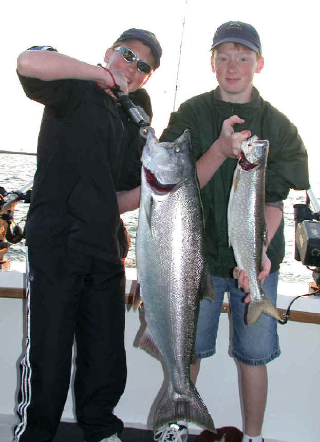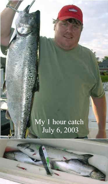 "Hi John, Today's report (7/20/04) is improved from the weekend, good but not excellent. Caught 8 kings and one laker on flies and cut bait with the "Reel Flasher."