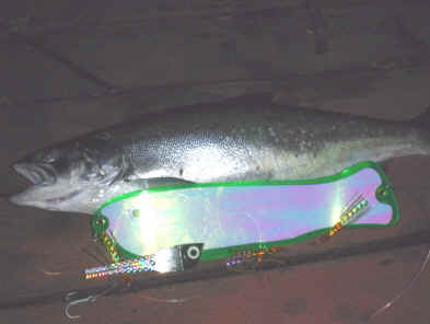 Hot baits were CJRF blue racer/blue-glow twink down 70ft and also one out on a low dipsey back 150. The next hot bait was CJRF pearl/glow w/white-glow twink down 50. My old standby green glow Coyote w/3 squid rig even took one of the "smaller" kings.