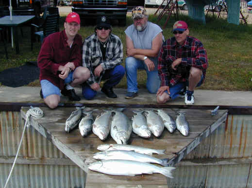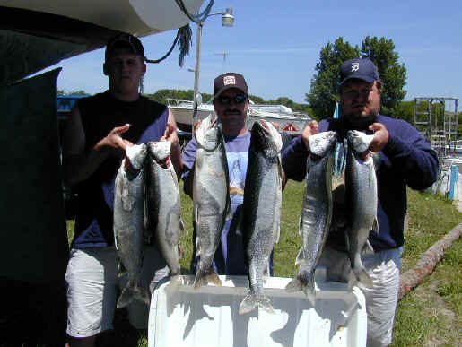 it at all. Tried to find another boat to run the trip and just couldn't. 5/17/01 I'm going to try and finish with the Saugatuck thing this weekend. I should be trailering the boat back Monday. With me being home I'll have time to finish the Bechholds Flasher Deal, Fishlander Spoons, and I'll setting up an account with Luhr Jensen. If you're a member of my E-mail list you'll be entitled to purchased fishing tackle at reduced rates compared to the stores. 5/16/01 I had to cancel the Bill Webb trip for today. Thunderstorms are nothing to mess with, let alone the high winds and heavy rains that accompany them. 5/13/01 8 fish were boated on the 2 Daves charter today after being cancelled out by weather yesterday. Boat Daves are world class folks to fish with. Plus I lost the original story Click here for their catch photo. 5/11/01