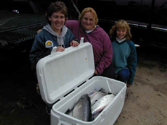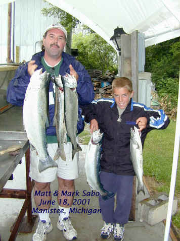 Manistee a tad). 5/27/01 Wayne and Julie Yoder along with son Doug tried to fish Lake Michigan today. The weather was windy from the north, raining and temperatures in the high-40's. Needless to say we cut the trip short, because of the nasty conditions. Plus, the north blow brought in a bunch of cold water, scattering the Salmon. 5/25/01