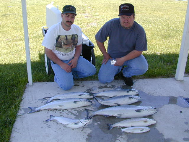 5/14/00 Mothers Day afternoon Bob Pyciak and Gordon Arnold met Capt. Lee Bienz and myself.  Gordon who is soon to be 40 years old got Mothers Day afternoon off from his understanding wife.  Well folks these anglers had a fishing trip!  The fish were on the bite definitely, with lots of strikes and fast action.  We boated 12 fish in a short order. Bob and Gordon caught 6 good sized Lake Trout, 3 Kings, 1 Steelhead and 2 Coho I believe.  We quit fishing about 7:00pm after starting at 3pm.  Good trip with 2 fine fisherman who have figured out charter fishing is a whole lot cheaper and less grief that owning, maintaining, and paying for dockage.  They had fished out of Onekama for a number of years out of their own rig.