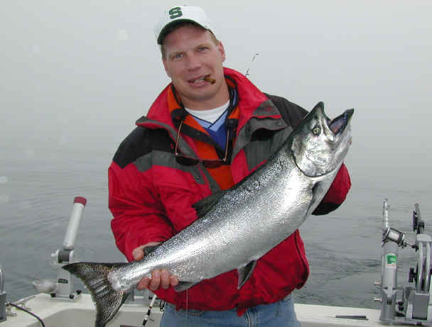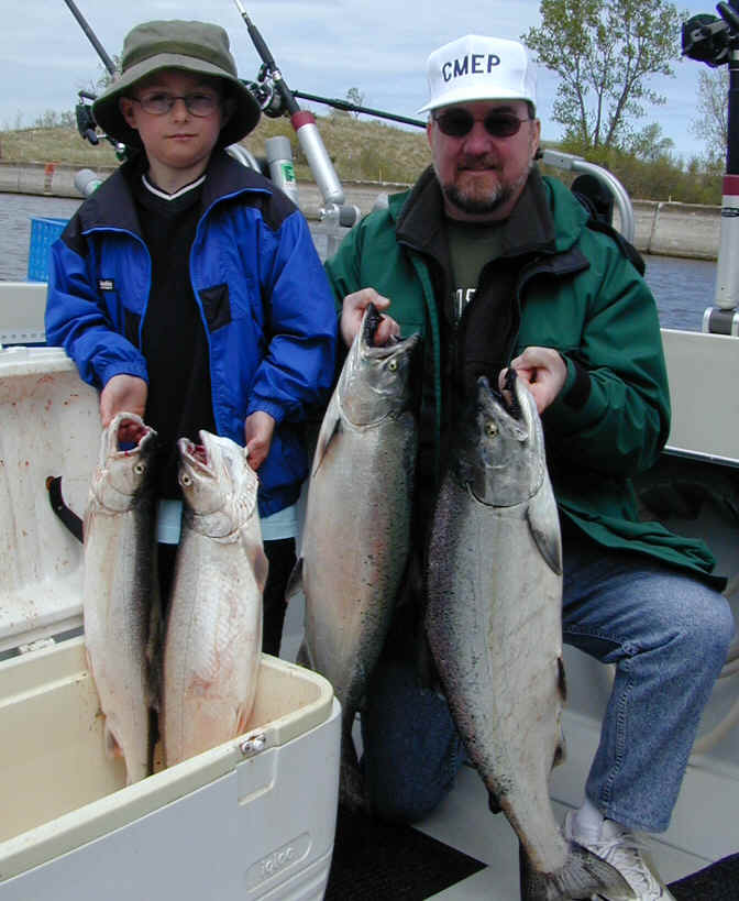 5/5/01am  Steve Jr. and Dr. Steve Fry met with me at 7:00am to hit Lk. Michigan in quest of Salmon and Trout.  Brutal east wind to at least 25 knots caused fishing to be on the slow side (wind from the east, fish do not feast!).  We still managed a couple of Lakers for the younger Steve (9 years wise) and a pair of decent line ripping, mean spring Kings for Dad to land.   Click here for the two Steve's photo