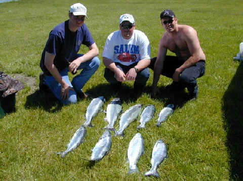 5/22/00 The "Big Ben Nietubitz Gang" showed up for a much needed day off from the Ford Wayne Stamping Plant.  The "Gang" members are "You Can Call Me Al", Ben and Larry Lisicki, are the leading wizards  of the Tool and Die Department.  Also, they were accompanied by Florida refugee Bret Travis is a Back Country Specialist for Snook and Red Fish.  This group had an awesome time on big, mean and wild Spring King Salmon.  The body count on the fish was 9 large Salmon to 22 lbs. and one little shaker.   The key here is that these fisherman never encountered Salmon before and were amazed at the brute strength of Spring Salmon, they now know why they're called Kings.  For being first timers the skill of these anglers was put to an incredible test and they passed it with flying colors.  Overall great time for everyone today!