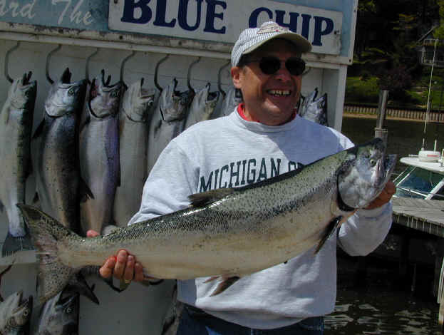 5/12/00 Debbie Wolf at Best Chance Sporting Goods in Saugatuck reports the Capt. Kevin Shippa who pilots the "Blue Chip" boated 14 fish on yesterdays charter (mostly Kings).  He fished just slightly south of Saugatuck in 180' to 220' of water.  His best lures were the Blue Maui, Blue and Yellow Dolphin and Fruit Cocktail Stingers.  The recent batch of Thunderstorms and High Wind has put a damper on a lot of fishing trips.