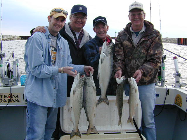 5/17/00 Larry Pompili and his Dad fished with Capt. Lee Bienz because I had a prior commitment.  Capt. Lee did a fine job by LIMITING OUT his anglers with a nice mixed bag catch of Salmon and Lakers.  While I can't elaborate much on Larry's trip I do know that this was the first time he limited out on Lake Michigan.