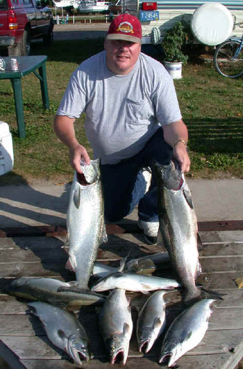 here for tips, techniques and area fished on 9/29/02 9/28/02 Andy S. and 3 young boys were my guests for today's cancelled trip on Lake Michigan. 35 degrees at 7am with a 20 mph wind, plus the youngsters had no heavy winter coats, so I put this trip off until tomorrow. Three frozen "kidsickles" isn't my idea of how to win friends and influence people! Made it over to the net pens at the Little Manistee, and they were crammed full of adult Kings, or Chinooks 9/27/02 Never made much beyond the pier heads this morning, as 2 to 4 seas (and building) dashed any hopes of a trip to deeper waters. So, we made a lap around the harbor without any takers and put the boat back on the dock. 9/26/02 Mr. Don Van Stoyk was my guest for today's Lake Michigan semi-fruitless search for Steelhead. Lack of any decent water temperature is the problem off Manistee now (too warm, 63 degrees to a 100 feet). Even over 700 feet of water, down temp is over a 100 feet down. Also, it didn't help our box much, when we missed the first 4 opportunities and we only ended up with one Steelhead. I got a better plan for tomorrow's effort, check back to see if I figured out what needed to be done? 9/25/02 Going to ready the boat for tomorrow's mission with Don Stoyk and do general late season maintenance. Adjusting to a surface (top 30 foot) fishery means, stowing all the flashers, J-Plugs, dodgers and flies. Spoons will be the food of choice if I can located the mother lode of Steelhead. 9/24/02 If the weather allows, I'll be fishing on Lake Michigan this Thursday, Friday and Saturday. Steelhead and next year's Salmon will be the name of the game. If the fish can be located, the catching can be beyond fantastic. A few years back, we boated 28 fish in less than 3 hours, dock to dock! 9/22/02 A severe cold has me laid pretty low, so low, I'd need a step ladder to crawl over a dime. No updates for yesterday, or today are available. Hope to feel better soon, because I'll be fishing this week. 9/20/02 The party is pretty much past over, as far as the Salmon for the 2002 Lake Michigan season is concerned. I'll be fishing next week (weather permitting), and the main focus will be Steelhead. Late September and early October offer some of the best fishing of the year when adult silver bullet Steelhead begin their annual fall run. Look intense limit catch action near the surface (top 40 feet of water) over depths ranging from 400 to 600 feet. 9/19/02 Made stupendous progress in my