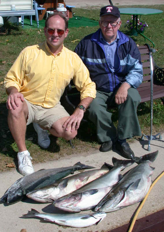 incredible fishing expedition! 9/6/02 Bill and his father Karl were my guests for this morning's half day Lake Michigan Salmon quest. Sloppy water to the north meant, we moved the boat 8 miles south for calmer conditions. Quality was the focus of our catch. We boxed 4 worthy adult Kings to about 20 pounds and a Coho. The interesting thing about today's sojourn was that Bill flew his private Cessna up from Toledo, Ohio in less than 2 hours. Both fishermen did fine on the rods for the action we experienced in an extra-strong east wind this morning. Click here for Bill & Karl's catch photo 9/5/02 Catch'em quick is the theme of