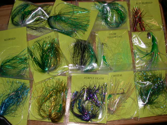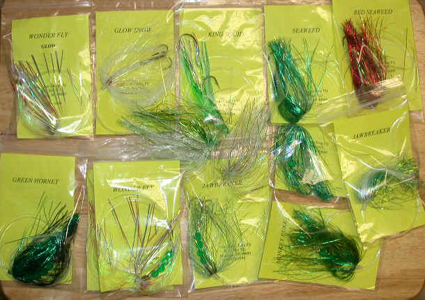 2/10/03  I wanted to introduce 2003 line-up of Capt. Len's King Fly today.  This is a premium product and was a mainstay of my attractor program during 2002.  All of his flies are patiently hand-tied in a fly vise with meticulous care.  A slight delay means, these fine trolling flies won't be ready to go until sometime early next week.