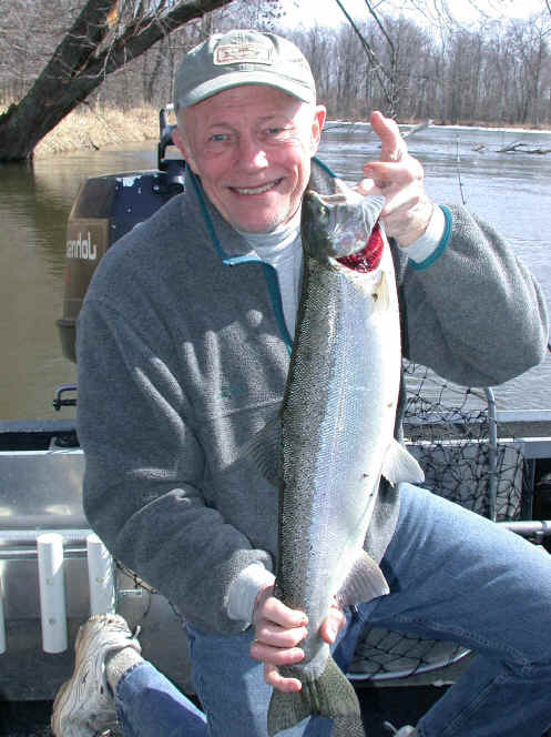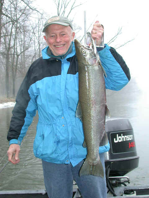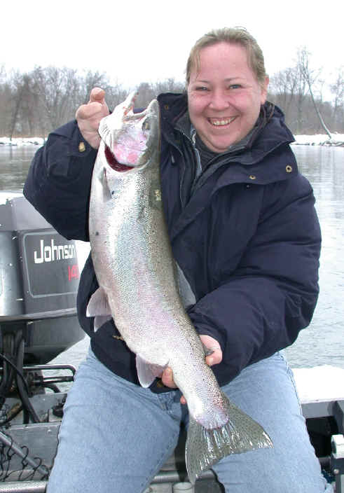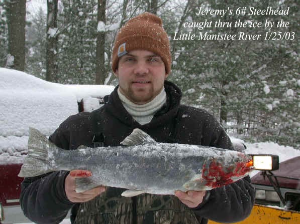 1/25/03  We got our butt kicked by at least a foot of snow at my house in the last two days.  On a trip up the western coast of Michigan yesterday, I noticed the Kalamazoo, Grand, Muskegon, White, Pere Marquette and Manistee Rivers we're all frozen shut in their lower stretches.  Not much attention can be given to the Steelhead with the all the snow and extremely brutal weather lately.