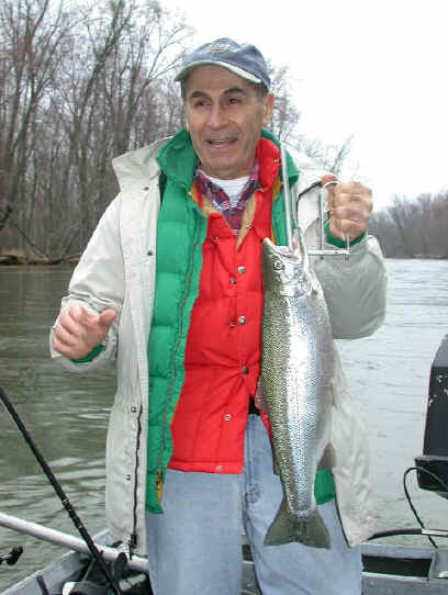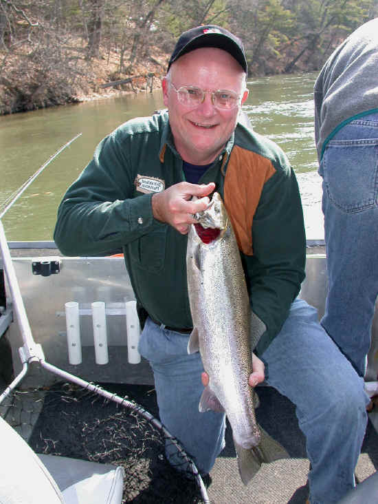 I asked my guests if they could re-schedule and that was out of the question, because Charlie had driven from Cleveland Ohio to fish with his Dad, Wes.  So, I rowed 2000 pounds of boat from Bear Creek to Rainbow Bend, at times against the wind.  I was trying to save their fishing trip at all costs, because of the distance traveled.  Needless to say it wasn't gonna be my day, as the Steelhead were non-existent for us.  We seen two fish caught in 7 hours on our very slow journey downriver.  We heard another boat had one for a grand total of 3 fish caught in our 3 1/2 miles of river.  The only good thing about yesterday was the patience and tolerance level of my gracious guests.  I posted a picture of last year's result (3/26/02) on this day, just to remember what a 17# trophy Steelhead looked like.  There's just not many fish in the river, as of yet,  It's a dog eat dog world out there and I had Milkbone underwear on yesterday.  Thank God I have today off!