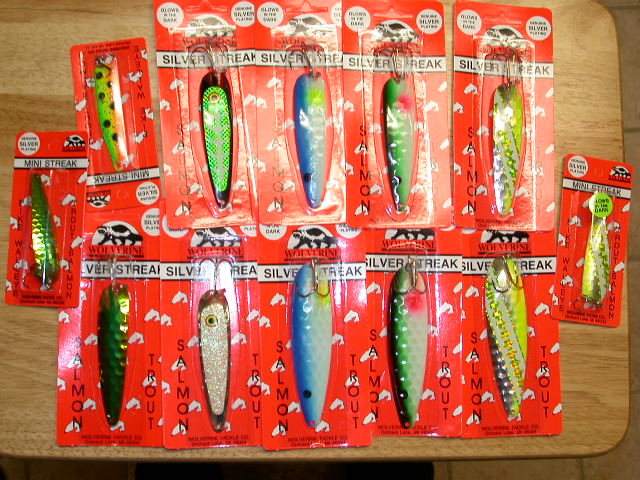 2/27/03  We have entered into Streakville today, because the 2003 line-up of custom painted, or taped Silver Streaks is now in hand and ready to ship.  The packs I've put together for the upcoming season contains all my "hot lures" from 2002.  Capt. John's Dirty Dozen is laden with the deadly, glow-in-the-dark  hammered finishes.  New for this year's agenda is the Whopper Stopper Pack which is geared towards this summer's "tuna time."  It has doubles of the 5 best magnum sized spoons known to mankind, if your quarry is Mr. King Salmon in 2003? click here to see how the early & late fish see this selection of Streaks