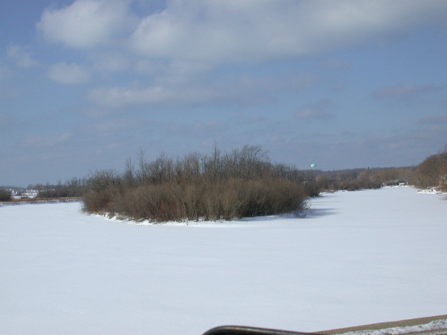 3/13/03  The Big Manistee River is still mostly frozen over by the M-55 Bridge.  The way I see it is, we're about a week away from the good Steelhead fishing.  Predicted warm temperatures and rain on the Monday will really shake things up.