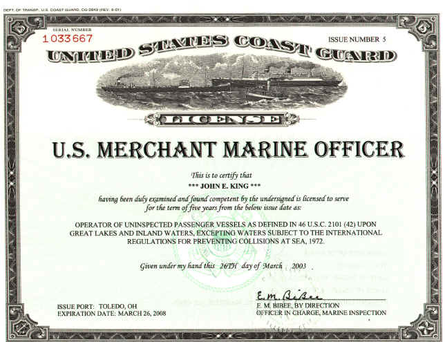 3/30/03   The best news about yesterday, is that I received my 5 year charter license from the USCG Station in Toledo, Ohio.  After a threatened delay until mid-April, because of homeland security issues they processed my paper work even before my old license lapsed 3/31/03.  Click here to see a reel-charter license