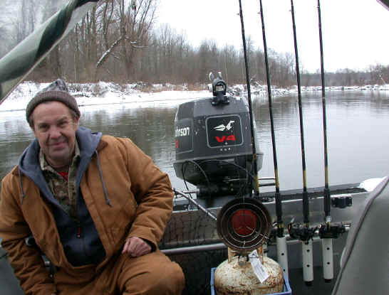 1/10/03  "Supposed" to be fishing the big river tomorrow.  However, with a balmy high temperature of a predicted 18 degrees, it would be plain foolishness.  So, I'm canceling that tragic deal before it starts.  If the high doesn't at least hit 25, the ice that builds on the boat, shift and steering cables, makes life miserable for me.