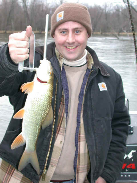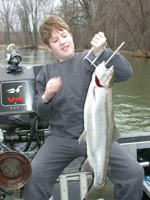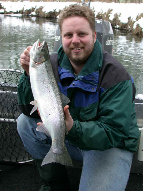 3/28/03  Things kinda improved somewhat for us yesterday, 4 Steelhead, 1 Carp-Sucker and at least 9 good solid strikes.  I think we finally rode on a lucky streak with the first three holes we fished all had Steelhead in the them.  Boxed 3 fish by 10am and a then Carp-Sucker put a curse on us, because misitius set in.  We finally boated our fourth fish of the day in the last hole we fished around 2:30pm.  It was good thing to see a few fish cooperate instead of sitting there all day long making excuses for fish that just didn't exist, or plain wouldn't hit!