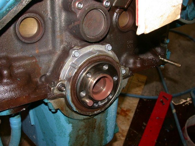 1/18/02  I stopped procrastinating and started the tear-down on my boat engines.  First it had to be determined what year the motors when manufactured.  So, that meant removing the transmission, bell-housing and flywheel to see what style rear main seal it was (1986 engines).  Then I ordered a new long-block for $1,799.00 the port, or counter rotation engine from a place in North Carolina.  Shipping by truck was around 180 bucks too!