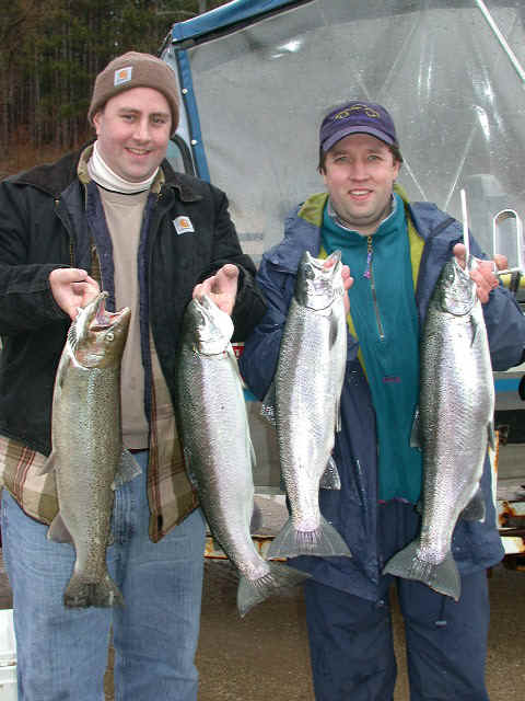 2/6/02  The lower end of Big Manistee River is frozen solid by the M-55 bridge.  Steelhead and what looks like fat chunky rainbows are being caught thru the ice on Manistee Lake.  If you're interested in learning how to fish Steelhead thru the ice E-mail me at kingscharter@yahoo.com and long friend and deckhand, Mark Pefley will show you the ropes at an all too reasonable rate.