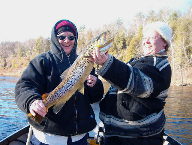 John, the 2 pics are of my wife Vicky and her best friend Sherry both fish were taken on the Muskegon river between Thornapple and Henning Park.  The pic with both girls is a 26 1/2 inch river run brown we had to chase the fish down river.  Fishing has been reel good been catching fish all through the system.  We've released all of our fish back to the Muskegon River for prosperity, except the brown he's getting mounted.  The wife and I are coming up to the Manistee to fish on Jan. 17 and you're more than welcome to sit up front with the wife and heater.  If you'd like go along, let me know?....(I said yes, Capt. John).  Pay close attention to the body shape how the spots are ringed, denoting a river Brown. Click here for a reel-gorgeous river Brown