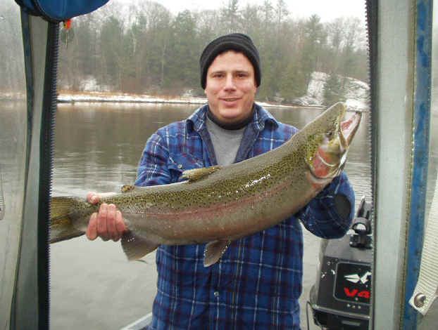 12/17/03  Capt. Jay Frolenko reports fairly good Steelheading on the Big Manistee River.  While the details were kinda sketchy, it sounded like he hit at least 4 fish.  This is fantastic, because this was Capt. Jay's initial shakedown cruise with my former riverboat.  I'd like to say, his photos are excellent, especially when you factor in, it was the first time he used his new camera too! Click for Rick's 1st river metal-head