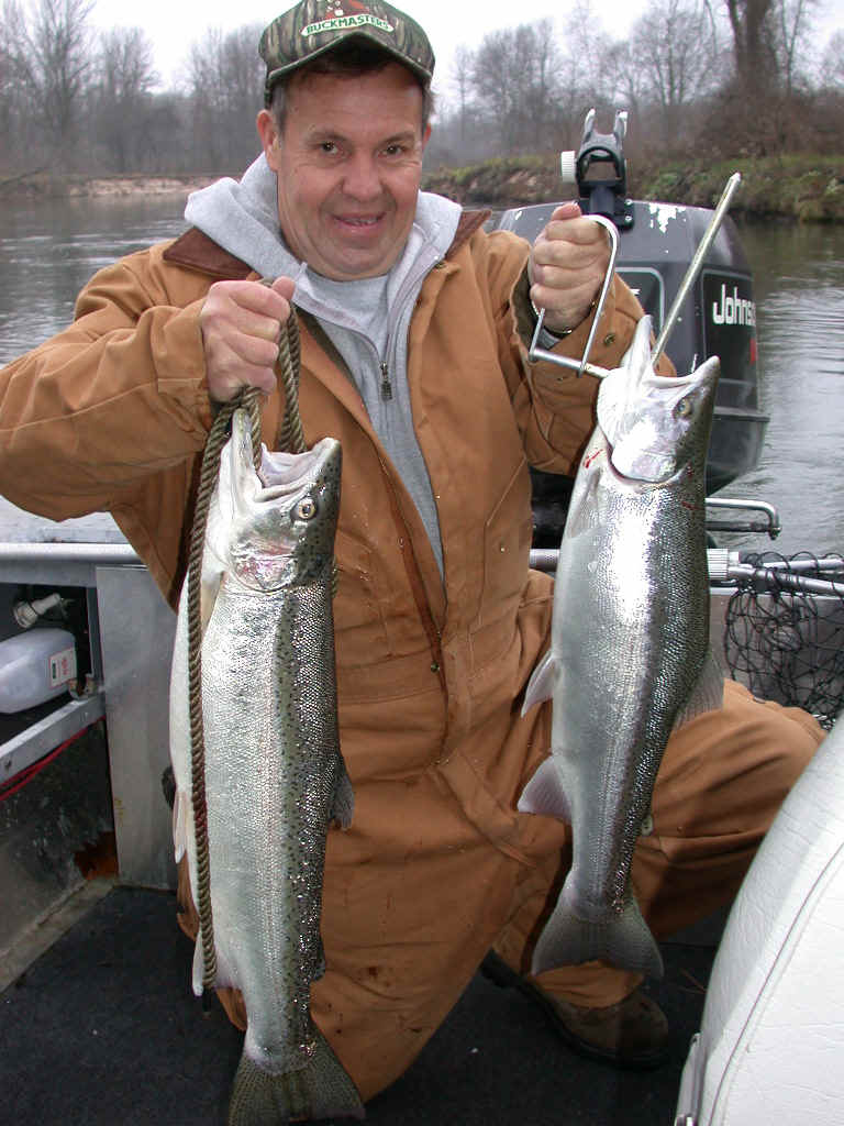 12/19/03  Yep, the votes are in from the recent poll, and you the jury has spoken!  The consensus is that Capt. Bob's deal on going 6 for 6 on Steelhead in the big river was a "Fluke."  Well, that might be kinda right, but major skill is involved in bringing those noble creatures to the net.  Steelhead, by any means are not an easy fish to land.  Especially, when you factor in the logs, tree trunks and brush that clog the big river.  So, make take on this subject?  I think it was his patient rodsmanship that won our day!  In fact, I don't know......if I've ever had anyone on any boat I've owned, who has gone 6 for 6, except for me back in the "early days" of the late 60s and 70s.