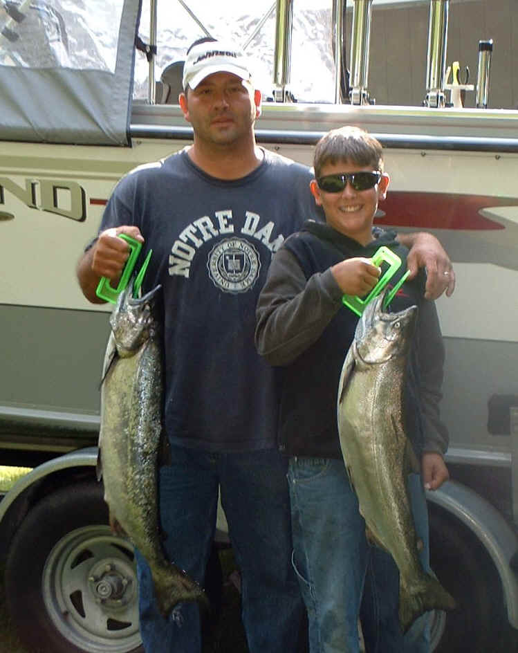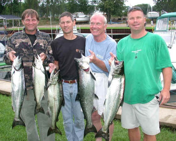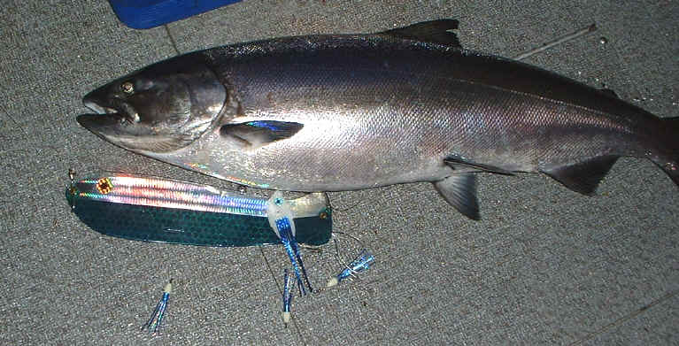 The fish were on a tear! The Kings were all over the darker colors and some colors I would never have guessed. It was black gold and black red, which may have something to do with them being so high in water column. We ended the day at noon as another storm with rain and 60 mph wind chased us off the lake. We had 11 Kings with 6 being 4 year olds, and 4 nice coho. After a mediocre June, July is off to a huge start".........Capt.