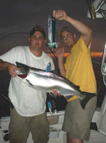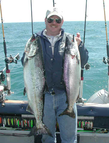....we went with only set 6 rods. Four with meat and two boards with spoons. The two dipsey rods were 70' and 80' back on 3 and the riggers were 28' and 35' down. We were seeing the temp break at 25 feet down. It went from 66 on the surface to 48 only 30 feet down.