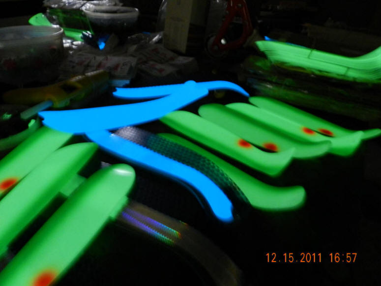 12/16/11  One of my favorite things is turning the lights off in the our tackle shop when a day's work is done.  That's when I get to see all the glowy tackle saying goodnight.  Decided to reveal this "glow in the dark" experience with you and snapped a pic.