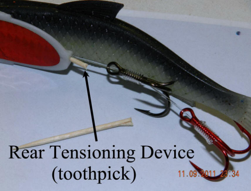 The low tech toothpick is all important to fishing meat.  The rear toothpick is actually a tensioning device that holds and controls the bend for the proper spin rate when using whole herring.  Tip: Insert the toothpick firmly. Click pegging rear line hole