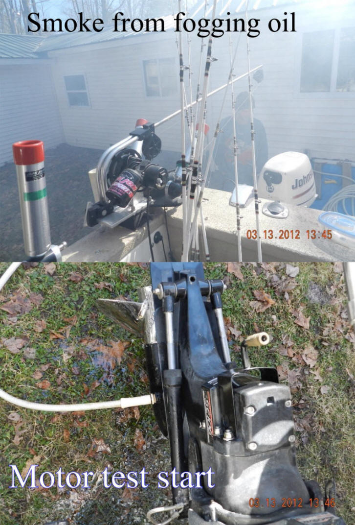 3/14/12  Among other various duties found the time to test start my boat.  This is all part of the process for the first shake down cruise of the season.  Today's feature photo shows the smoke from last fall's fogging oil being burnt off.  Ear muffs on the motor provide water for home testing.  Which is necessary!  Click 2012 motor test