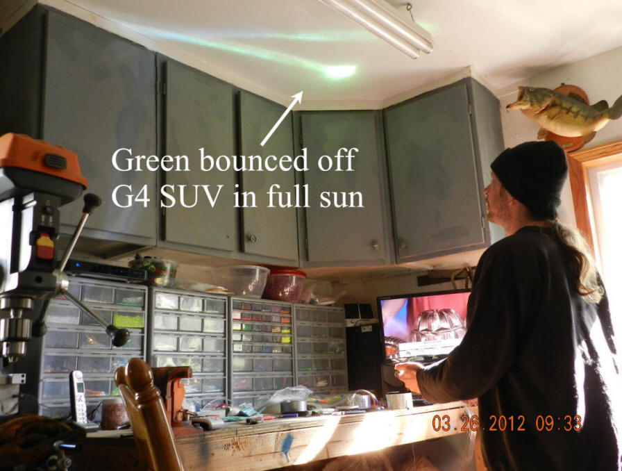 3/27/12  Yesterday while filling orders building the new 4G flashers there was a eerie green reflection on the ceiling.  Light was being reflected off either the special UV green process, or the green metallic light shifting paint.  Click for this reflection.