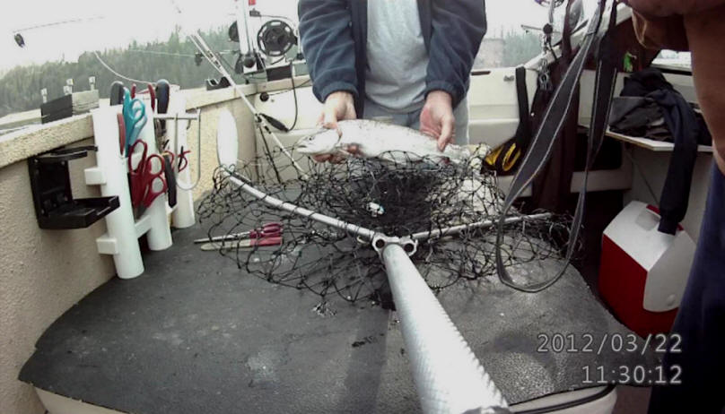 Trolled for 3 hours without a bite.  Hit a fish at 11:00am, then at 11:30am we boxed another small sub 3 pound Brown.  Missed our largest Brown at 1:15pm when it became unpegged 30' from the boat. Click 3/22/12 netcam Brown