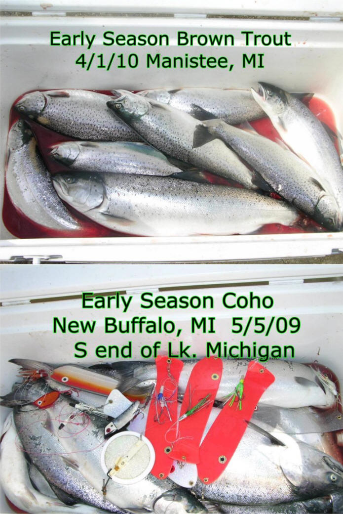 Click snow melt pic 3/25/14 Today's featured split photo of early season Brown Trout and Coho is what's on deck for Lk. MI anglers. Current news from the southern end of Lk MI around Chicago, IL say the Coho are there for the taking. Central Lk. MI ports will soon see shoreline trolling for Brown Trout front and center. Click early season fish 3/24/14 Getting ready to return to