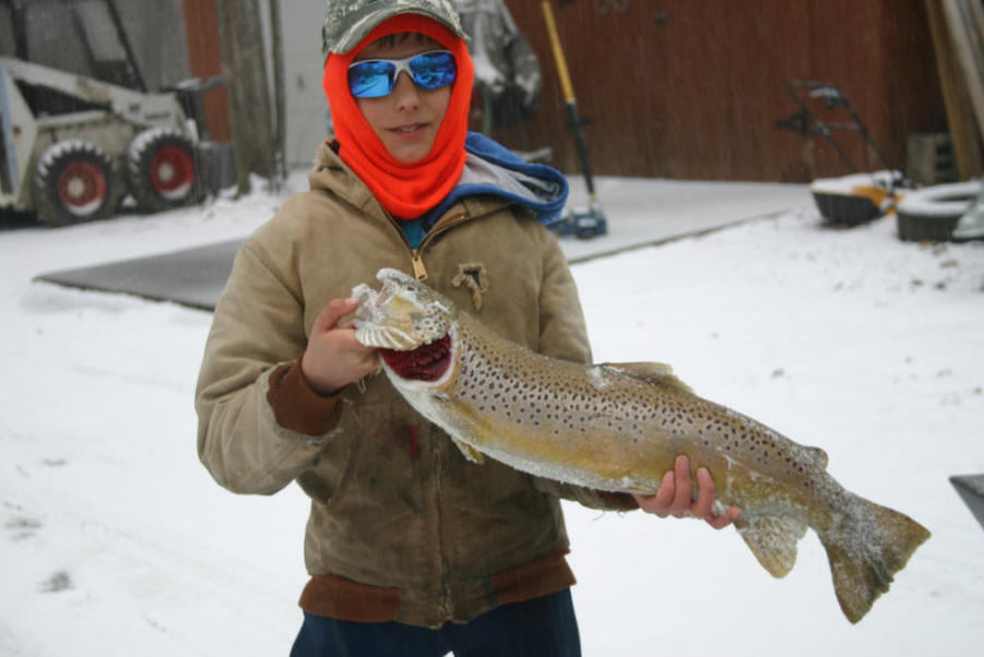 Mambas, or at least get a firm start. 1/12/15 There's an important feature to my new 2015 Salmon Buster™ spoons that's been overlooked. My Lexan™ spoons bend, but do not break, or kink like traditional metal spoons. Today's pic, with considerable force on my part ...shows a SB 4.65 being bent hard and still retaining it shape like nothing happened at all! Click bending Salmon Buster 4.65 1/11/15 Posted a pic of the recent snow for the snowbirds that flew S for the winter. 46 inches is my estimated total for this winter thus far. Click recent Manistee snow