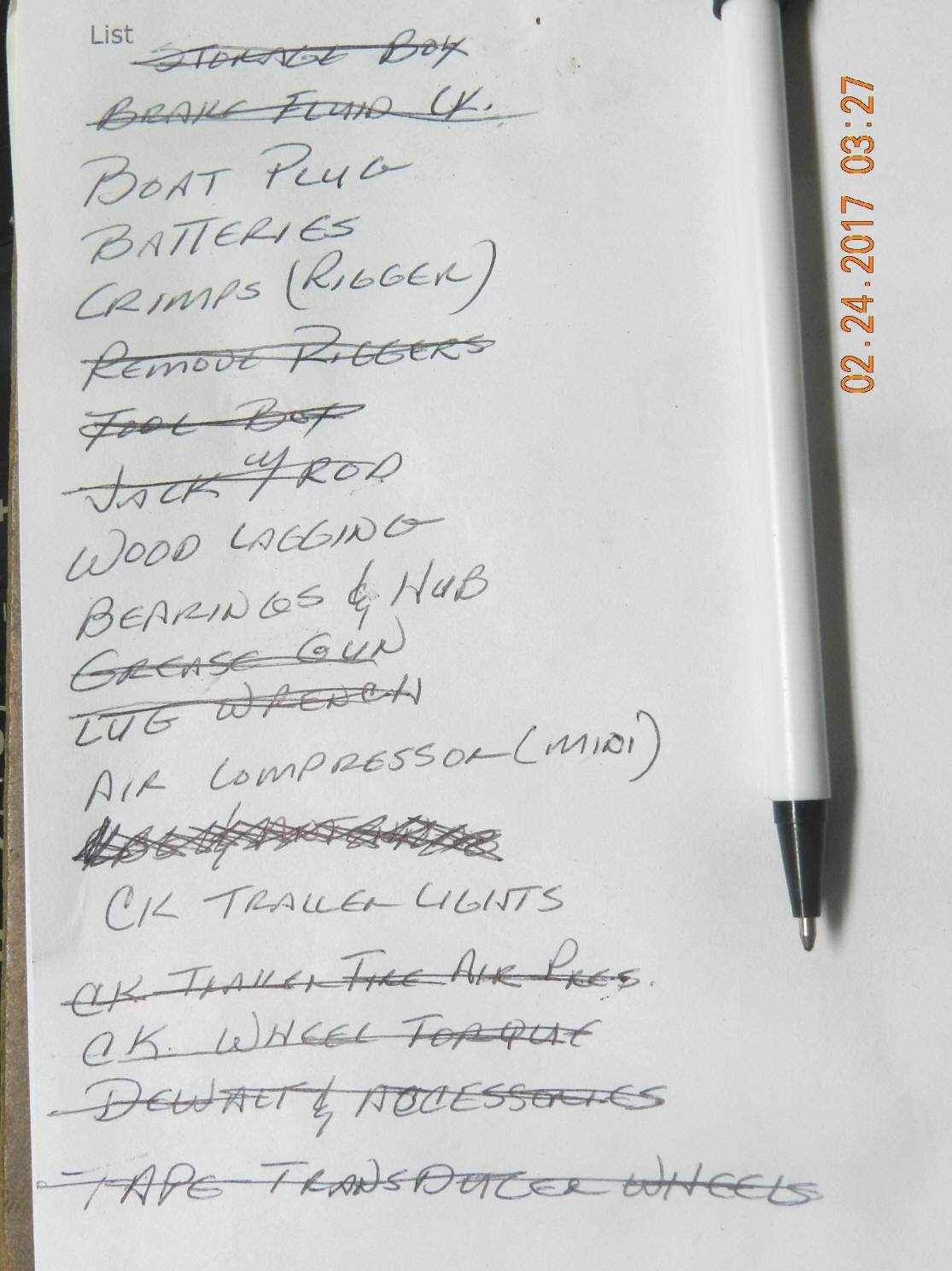 2/24/17  Boat trailer is ready and passed all system checks.  It's important to mention all my tires were about 10 lbs. low on air pressure.  This hurts gas mileage and low air pressure builds heat, causing tires to blowout.  When greasing your hubs, if you see milky grease seeping out?  This is sign you have bad wheel bearing seals that's allowing water entry.
