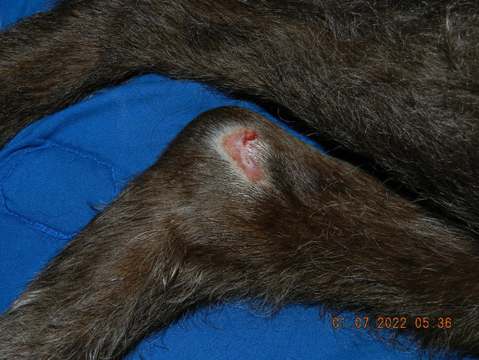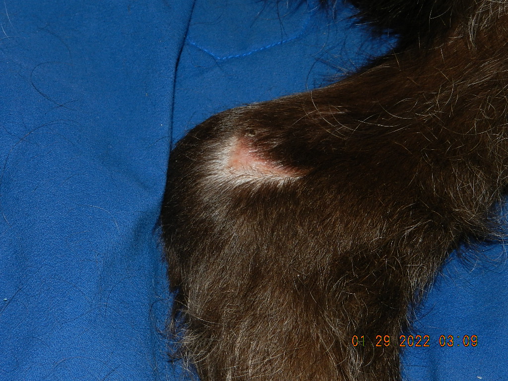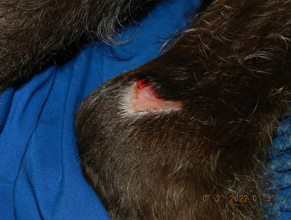 1/13/22  Scruffy's wound has closed up about 4 weeks after he was shot with a 5.56.  Know he wasn't shot with a long rifle 22 caliber that would have never blew out an 1 1/4" and 2" hole.  5.56s are usually chambered for AR16 semi auto rifles.
