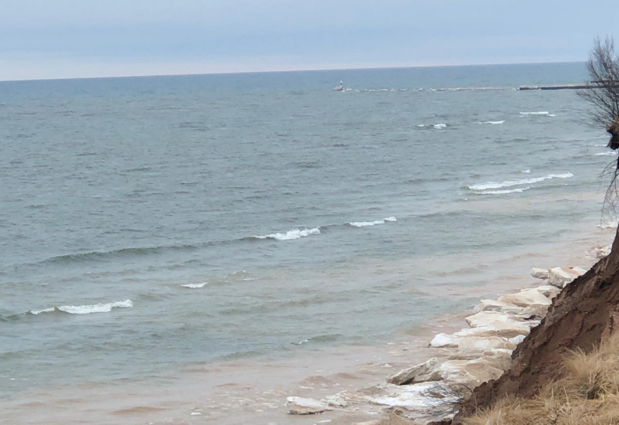 Setup on this pic is just S of Manistee, MI's pier heads from Merkey Road bluff that's evaluated maybe 80' to100' above Lk. MI.  This water needs some time to let the silt settle out before S is the direction to fish.  N could be a wiser choice with clearer water.  6' to 8' of visibility worked best for me.  If you can see the bottom in 10' in gin clear water don't expect much rodular activity. Click 3/20/22  gray-green Lk. MI