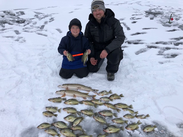 1/14/22  Recent cold weather built ice to a safe thickness on many lakes in MI.  Today's featured photo of courtesy of Chris G and son with a nice catch of Crappies and a few Pike.  Hardwater fishing provides outdoor recreation and great eating when the stars lineup.  See a fish fry in Chris's future.  Click Chris and son's ice catch