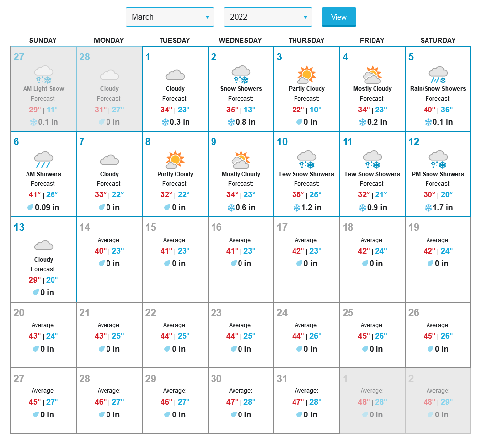 2/28/22  Posted a March calendar of what to expect for daily high temps, as we creep ever closer to Spring 2022 on the 20th of this month.  We won't hit the 40° average daytime high until the middle of March.  Know 40 don't sound like much until you look back at the single digit highs and below zero lows. Click March average temp calendar