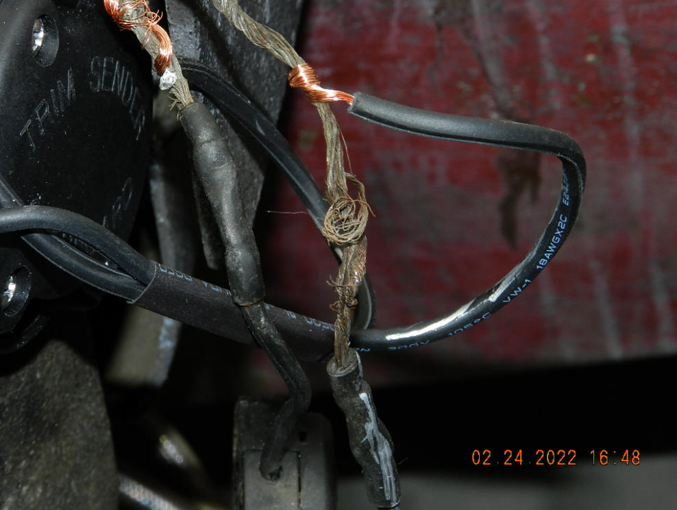 2/25/22  Today's featured photo is the wiring issues in the Mercruiser Trim/Tilt sensor job.  Discovered bare wires that need sorting out on both sensors.  Tilt sensor can turn the tilt feature off.  Need to be careful with this one.  Click wiring issues