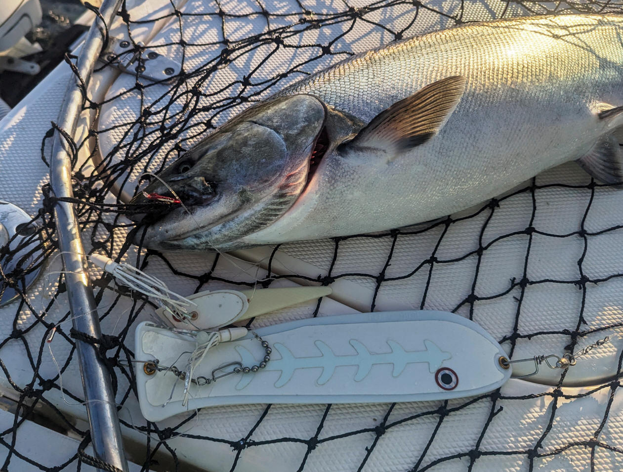 9/19/23  Today's spot-light photo might be even better then yesterday's when it comes to single hooks.  If you look closely? ...you'll see the point of the hook point protruding out a jumbo King's lower jaw.  Said yesterday, "almost impossible to lose a fish."