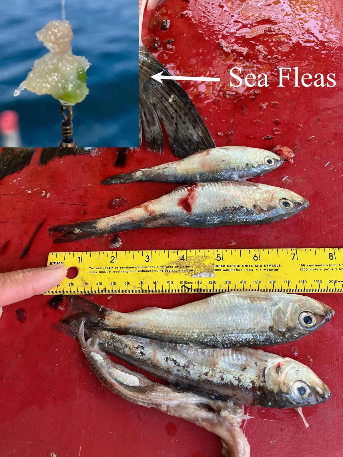 Today's photo is courtesy of Ludington's Capt. Kirk who always comes thru with great subject matter.  Also, Kirk's pic shows sea fleas. Probably, the fish hook variety that are are showing up too to povide a forage base for the bait. Click Kirk's bait photo