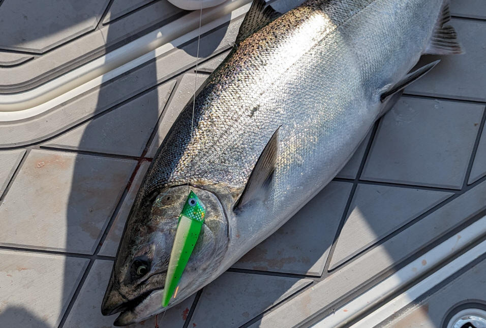 More interesting parts in this action photo show our LED Green Glow 4.65 Salmon Buster™ decorating this King's jawbone.  This fish was hooked with our optional 4/0 singe west coast hook setup.  If you miss a fish on a single hook?  It's on the strike.  Once that big hook digs in, it's welded making it almost impossible to lose a fish!