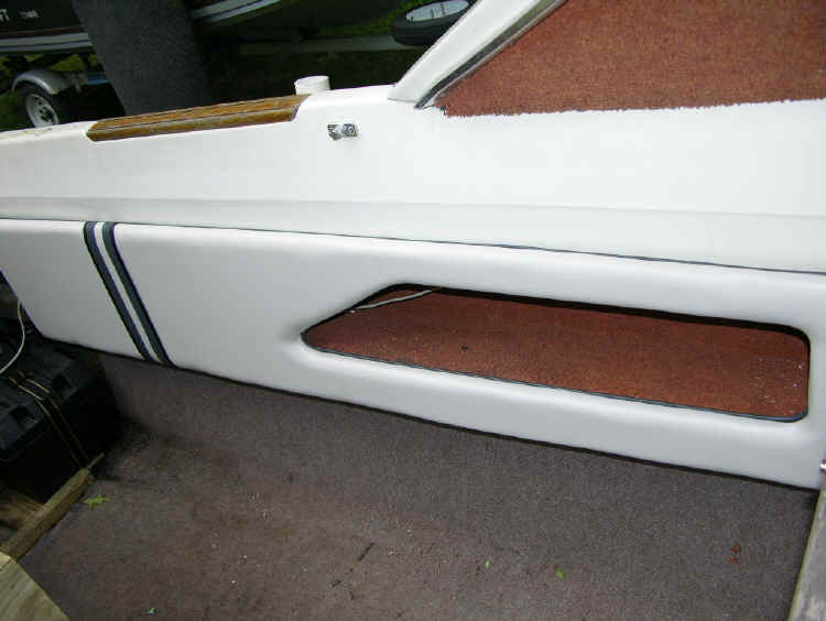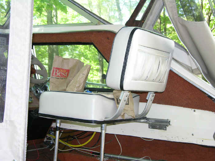 expertise with wood. 5/27/07 Filled the many holes with Marine Tex. Left over stuff from when I had my Cherokee that was still good after 5 years. Laid out final design of a soon to be installed trolling board. Coming up with adequate bracing to deal with the stress of 12 pound cannon balls with 4 foot of leverage requires careful thought. On schedule to get the rig to Bear Lake Marine in 2 days! 5/28/07 Got some work-thru issues with steering, cuz once the main engine is turned off, you have to fight the power steering ram. This does not bode well for running the 15 hp four stroke Johnson OB under trolling conditions. Cleaned up some of the mess in the boat for tomorrow's hike to Bear Lake, MI, which is 27 miles from my place, or the best part of 20 bucks away at 3.50 a gallon. 5/29/07 Taking boat to Bear Lake for controls on the trolling motor and installing liftable trolling motor mount. Oiled the teak battery covers with ATF. It red and far less expensive than teak oil. ATF works as good and lasts just as long, if not longer. 5/30/07 Made the back splash panels to cover the transom area, they came out better that expected. Picked out the new cockpit side combing cushions and they look simply beautiful. Picked up a 20' piece of 7/8" stainless to make the bird pole stanchions and new rocket launcher for the hardtop top. 5/31/07