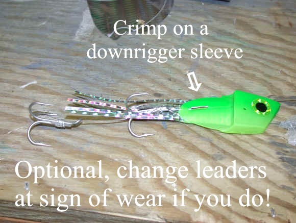 tries to munch your meat, there will be a straight pull driving the hook into it's mouth. I never was satisfied with snelling trebles until I came up with this idea on 6/22/04. The beauty of this re-rigging is you use the existing 3 fly deal, you only add a snap swivel to the last attractor fly, then by using a double overhand loop, re-attaching a new leader and double snelled treble will be a whole lot easier then engineering an entire 3 fly trolling rig. I've spent countless hours trying to solve the existing problems with the cut-bait in hopes to better enhance your chances of success. I hope you like my latest creation that should be the standard of rigging meat holder heads in the next few season. Just remember you seen it here first on the www.michigansportsman.com