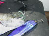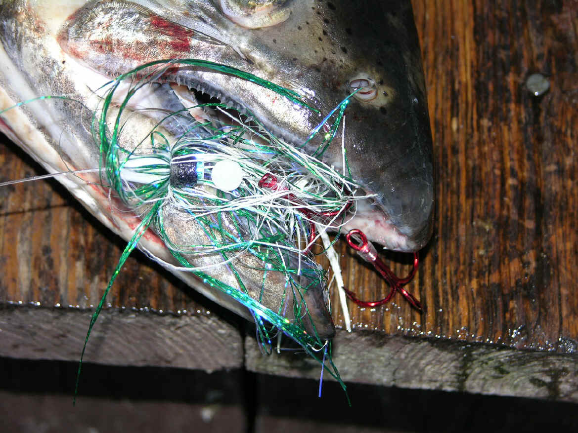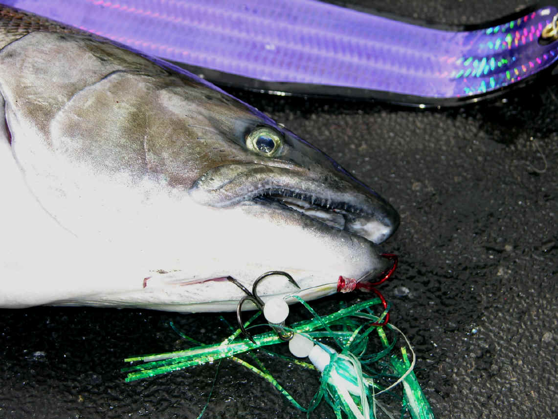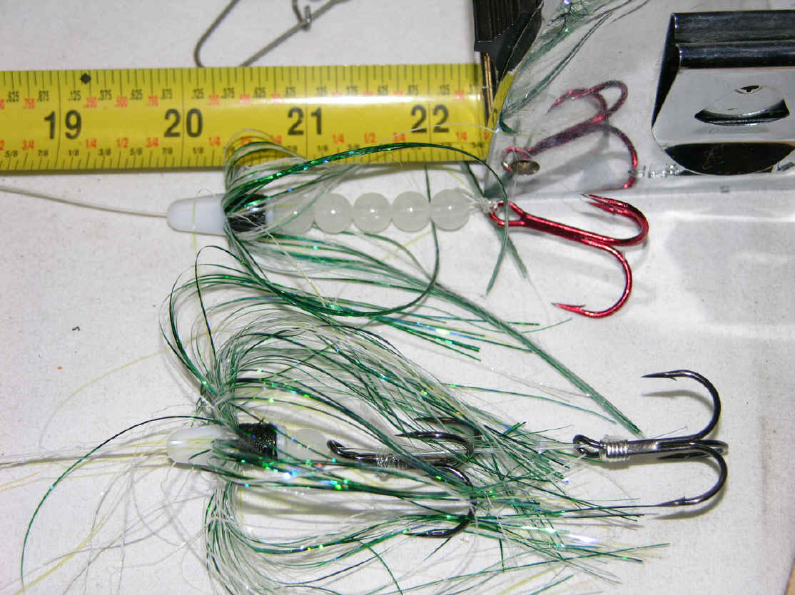 Double Your Pleasure, Double Your Fun! Missing hits on flies is now is a thing of past since we changed over to double snelled trebles. On 8/31/08 we boated let's say ...one fish out of 4 diver bites. 9/2/08 we wised up and changed over to all double snelled trebles on our flies, same as on our meat rigs. We didn't miss any hits on our divers hits that day, or the 3 diver whacks on 9/25/08. Not hooking up hits on our trolling flies is now ancient history since we went to all double snelled trebles on our trolling flies.