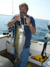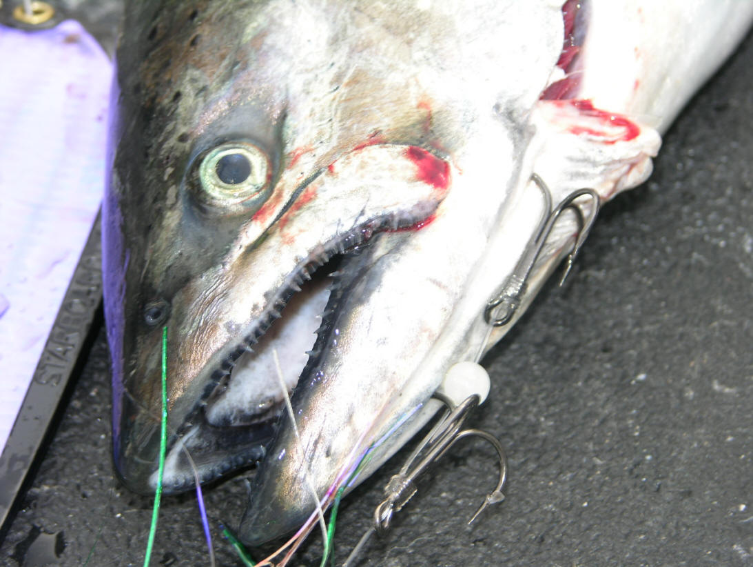 Looking Prisoners Instead of Escapees? The majority of the reference material for this article was collected on 9/2/08 out of the Port of Manistee, MI. We fished the hours of 9am thru 2:30pm (lines in the water). This was a revenge trip from 8/31/08 where we missed approximately half our hits on flies and BTI 10" Flashers. This was our first effort with all trolling flies equipped exclusively with snelled tandem VMC treble hooks. We had 11 bites and capitalized on 10 of these opportunities. We used a dual meat and fly program. Are best action came over 160' to 180' on 9/2/08. Meat Deep The deepest part of our 3 rigger program and 2 diver spread was towing meat in the 80' to 125' depths. Water temp at 80' down was 52 degrees. Then falling off gradually to 38 degrees at 125'. All fish that bit on the 80' to 125' riggers ...in the cooler waters fully engulfed the flasher/meat rigs. Taking the bait way down their throats and the hooks were deeply embedded on the inside of these deep fishes chops. Fly High After taking several photos it became 100% clear every fish boated on our divers, fished in the higher part of the water column pulling flasher-fly combos were all hooked under the fishes snout. Not one BTI flasher/fly combo caught adult Salmon on 9/2/08 ever fully committed to opening their jaws. If the flasher/artificial trolling fly caught fish were hungry hard-hitting eaters? ...we'd have been taken photos unhooking the fish with hooks buried down deep inside their chops. This was not the case, as the images on this page plainly show! The intriguing part is the snout/chin hooked fish up higher in the water column in the 70 to 58 degree water. While it was possible to pry hits out of these warmer adult Salmon, these fish were not willing to attack as to swallow the offering. Conclusion These photos proves there's two