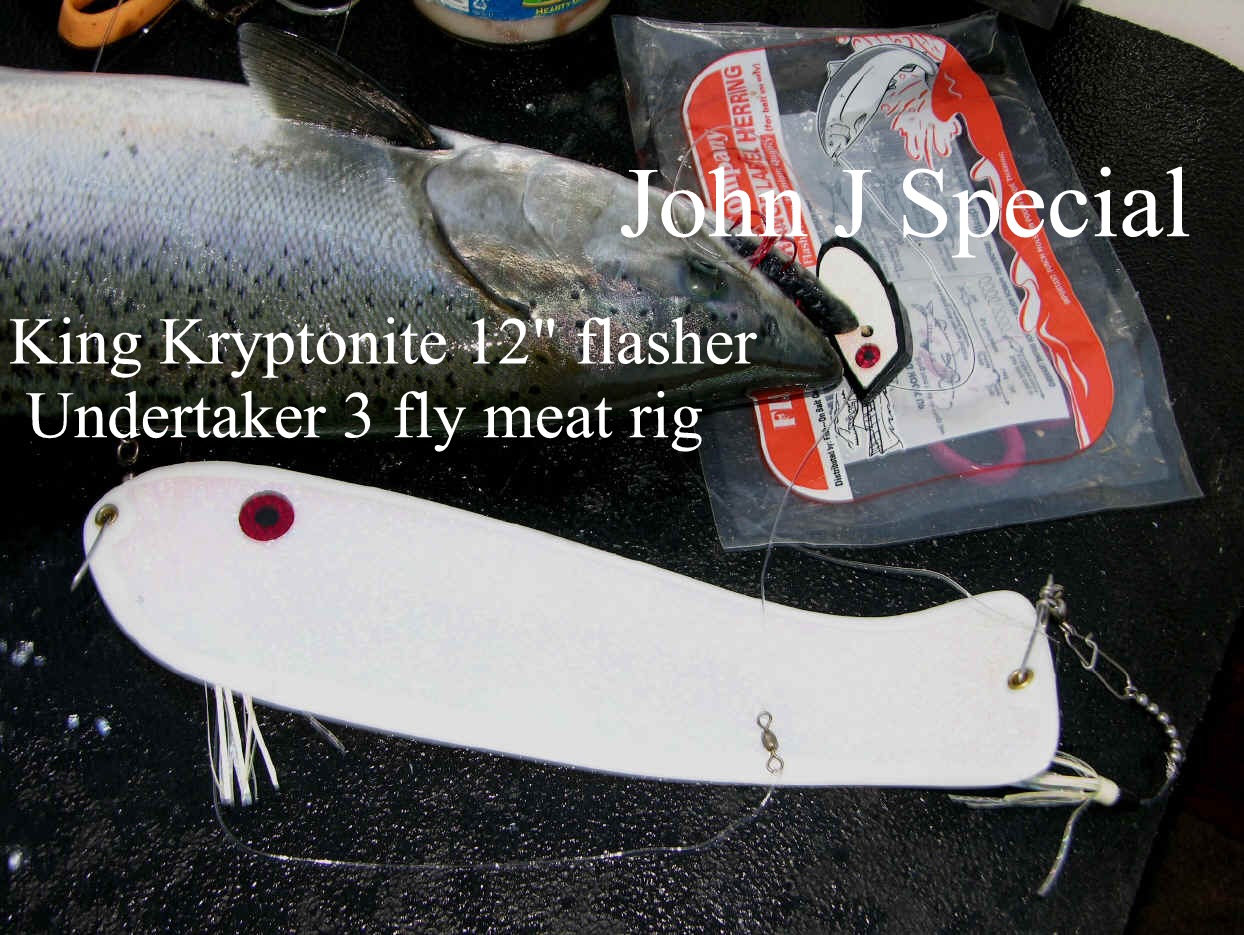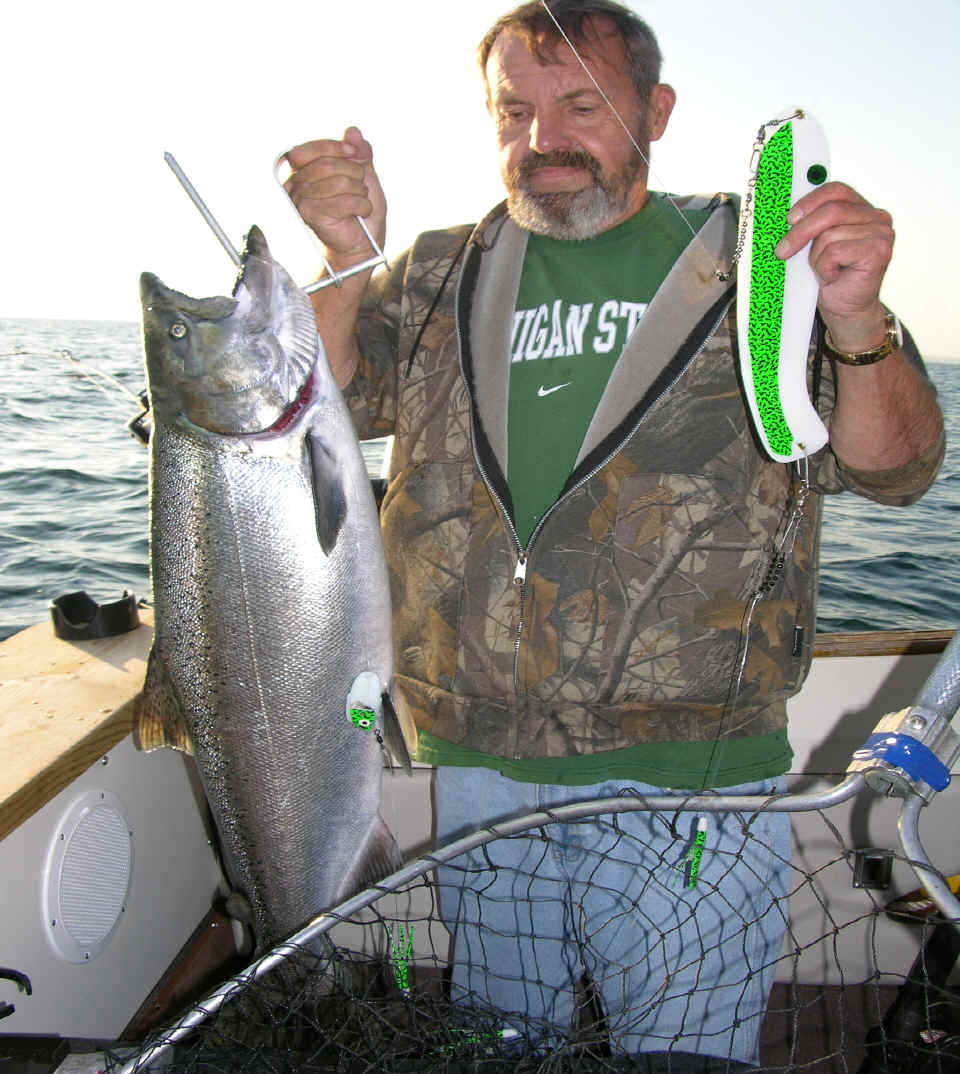 Snippets 1. Extra sharp hooks, pay attention to this important part of your weaponry. Off peak bite will afford opportunities at the rate of 2 maybe 3 bites an hour if you're over fish. Learn to turn hits into boxed fish with focusing on details. 2. Mid day fish will generally be deeper cold water fish in temps from 44 to 38 degree and semi lethargic. Meaning your adversary will not run down a meal that looks to hard to eat. Slow troll from 1.5 to 2 mph will aid in tantalizing your target species. 3. Mid day is when the wind picks up. It's easier to do a long downwind troll with the waves at your stern. If you've located a good 2 mile piece of water it's a lot quicker to pick up lines and travel to the original point of beginning. Getting speed right will be a heck of a lot trouble-free to duplicate rather than trying to fight a head sea. Plus, a bunch more comfortable for you and your crew. 4. Set a goal, or a point to travel to in an effort to cover water. Some of this is for exploration purposes to sort out the fish holding water and depths before retracing unproductive routes. Avoid doing the same thing twice, double true if it's not working. Look at it like I do, if all I'm doing is making mistakes, let's make a brand new. Meaning a new tact, one not influenced by recent past performance issues. 5. Less stress is involved, cuz you're not going to be playing dodge boats that will dictate your trolling path. Lead core and copper? This is the time for this long distance program from the boat. Not when there's a ton of boats waiting to saw you off. 6. Do not crowd a lot of riggers all in the same approximate depth. We try to maintain a 15' depth separation on our 3 rigger spread. Mid day fish cruising for a meal can be turned off by too much stuff. Then stagger the leads with the deepest rigger have the shortest lead from the cannon ball and gradually increase the distance on the rigger that are higher. Our center rigger is the always the deepest with a 10 to 15' lead, next higher will have a 20 to 25' lead and our highest rigger will be back 30 to 40'. What's just been mentioned works if you concentrating on depths from 80 to 120 down. If you have to go deeper, tighten the all leads up more to like 10 to 12 feet if you're working the 150' to 200' depths. These deep Capt. Nemo fish taint all that fussy. 7. Use north/south