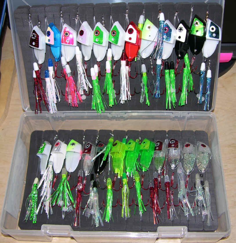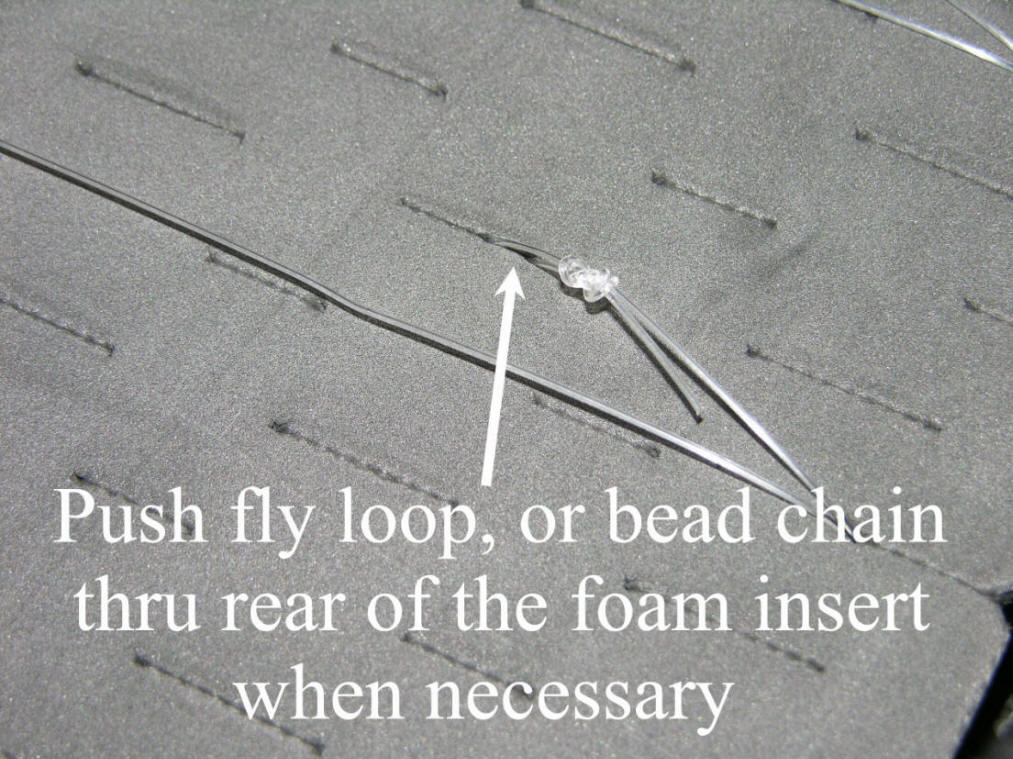 Loading Meat Rigs Load the foam inserts as pictured. Then, place the bottom inserts face down and the top inserts goes face up. This no hooks are touching and either foam insert/leader holder can be accessed easily. Keeping in mind all hooks must be loaded in the normal face up position and on the same side as the meat heads. Just press the hooks into the foam at a slight angle, then it's a straight wrap to tame the leader on the meat rig. Take your time loading and the rewards will far exceed what I charge at the webstore for this awesome storage solution.